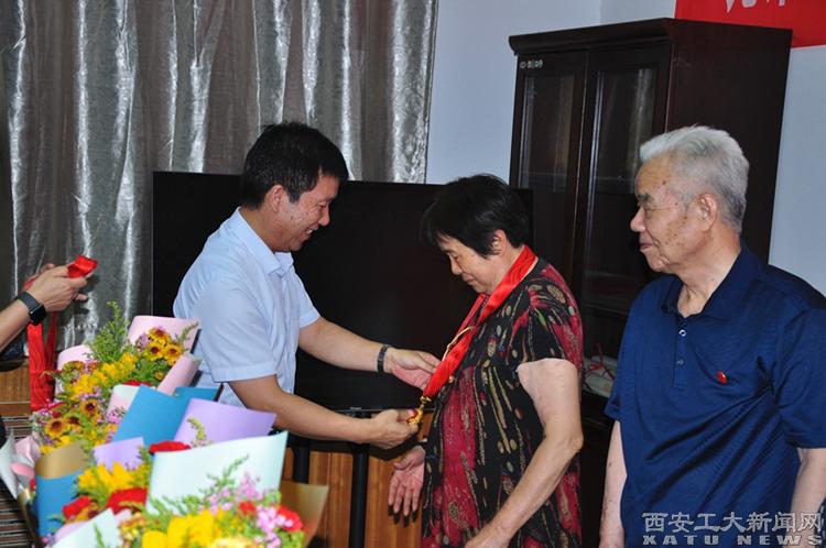 颁发仪式上,刘发林为“光荣在党50年”纪念章获得者代表一一颁发纪念章,活泼可爱的附小小朋友们为老党员献花并合影留念。