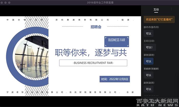 (本网讯)为给予毕业生精准有力的就业支持,更好地拓宽毕业生就业渠道,经济管理学院于12月8日下午在钉钉直播举办了“职等你来,逐梦与共”为主题的专场招聘会。参与本次招聘会的有中国水电建设集团十五工程局有限公司、深圳慧通商务有限公司、链家、优优财税服务有限公司、宁波奇邻文化创意有限公司和乐读等6家优秀企业。本次会议由毕业班辅导员王倩倩主持,共约320名毕业生参加。
