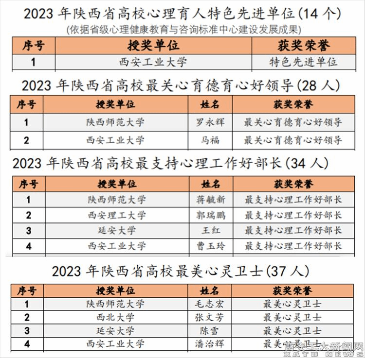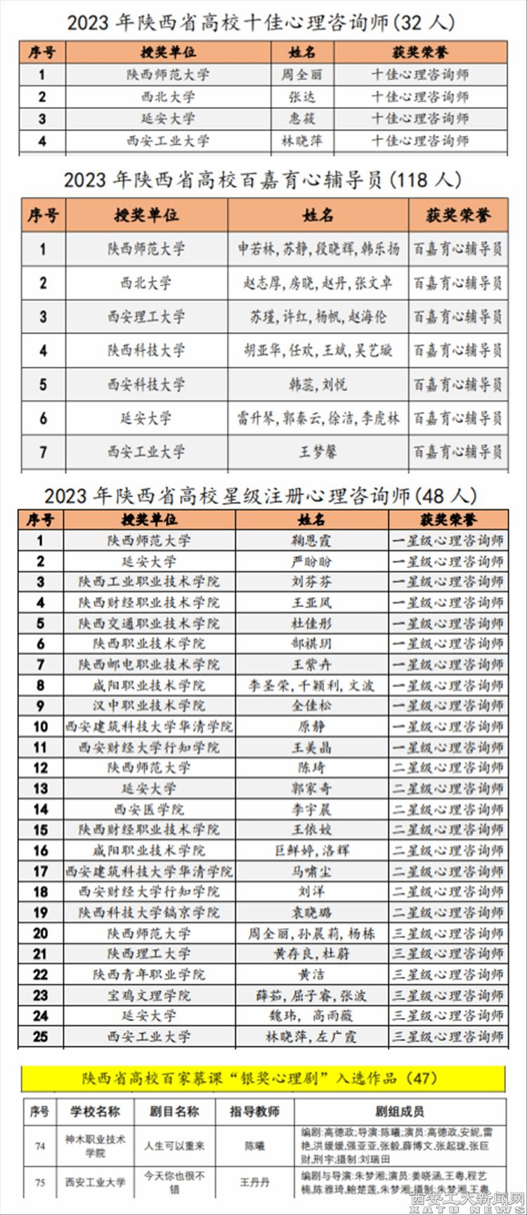 学校党委副书记马福获评“2023年陕西省高校心理育人最关心育德育心好领导”,学生工作部(处)长曹玉玲获评“最支持心理工作好部长”。学生心理发展指导中心教师潘治辉被评为“最美心灵卫士”,林晓萍被评为“十佳心理咨询师”,辅导员王梦馨被评为“百嘉育心辅导员”。在2023年陕西省高校星级注册心理咨询师执业年检中,林晓萍和左广霞获评“三星级心理咨询师”。ac米兰师生自导自演的心理剧《今天你也很不错》(指导教师为文学院王丹丹),入选陕西省高校第八届百家慕课“银奖”心理剧。