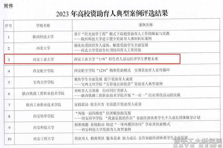 近年来,学校落实立德树人根本任务,通过加强顶层设计、凝聚育人合力、创新“1+N”特色育人活动,打造物质帮助、道德浸润、能力拓展、精神激励有效融合的资助育人长效机制,以“一份萌‘新’专属的爱心锦囊、一场走心的实践教育、一部燃心的励志电影、一本暖心的内涵好书、一次贴心的技能培训、一项强心的海(境)外项目、一颗砺心的自强之星……”N项特色育人活动,助力家庭经济困难学生全面发展、成长成才。学校资助育人工作不断受到上级部门肯定,2022年度获评“全省资助工作先进单位”,本年度先后受邀在陕西广播电台“教育百分百”栏目介绍学校资助政策、在全省资助工作培训会上作经验交流。
