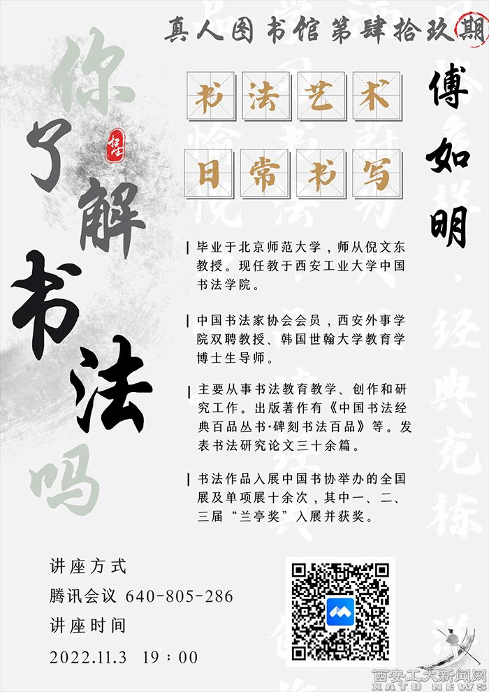 (本网讯)书法不仅凝聚着几千年的中华文明,也是了解中华文化传统、建立民族文化认同的重要途径,更因其普及性和广泛性,成为美育的重要组成部分。为了进一步提升ac米兰学生的书法创作水平,培育对美的感受力和欣赏力,提高正在开展的第十二届北郊三校纪念“一二·九运动”书画大赛参赛水平,11月3日,图书馆邀请中国书法学院傅如明教授做客“阅·行”真人图书室为ac米兰300多名同学带来“日常书写和书法艺术”的高质量讲座。