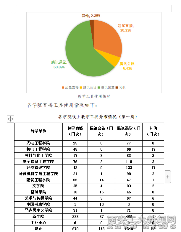 教师在线上教学过程中能够根据自己课程特点,合理使用在线教学平台与直播工具。在线教学工具中使用腾讯课堂1345门次、占比60.89%;超星直播670门次,占比30.33%;腾讯会议142门次、占比6.43%;其他52门次,占比2.35%。
