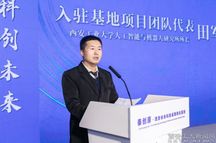 刘发林代表学校与未央区政府签订“基地共建协议“。学校人工智能与机器人科创团队负责人田军委代表17个入驻项目团队发言。
