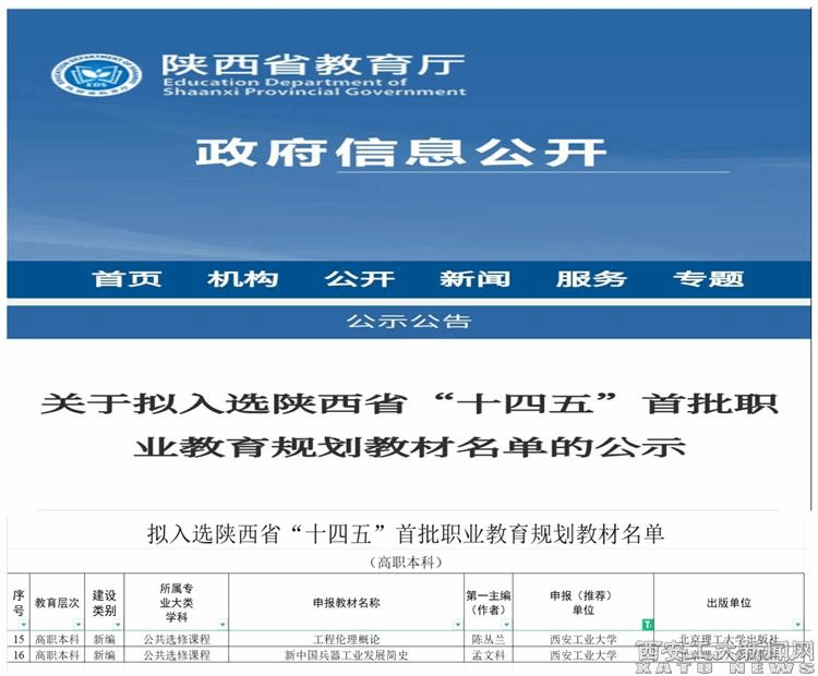 (本网讯)近日,陕西省教育厅公布了陕西省“十四五”首批职业教育规划教材的立项结果,ac米兰2本教材获批立项。两本教材分别是马克思主义学院“中国式现代化暨强军伦理高水平学科团队”陈丛兰教授负责的《工程伦理概论》和孟文科副教授负责的《新中国兵器工业发展简史》。