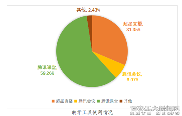 教师能根据课程特点,熟练使用在线教学平台与直播工具。在线教学工具中使用腾讯课堂1293门次、占比59.26%;超星直播684门次,占比31.35%;腾讯会议152门次、占比6.97%;其他53门次,占比2.43%。