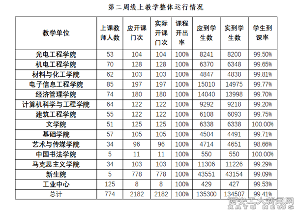 第二周线上教学稳步推进,上课教师774人,应开课2182门次,实际开课2182门次,课程开出率100%,应上课学生数135300人次,实到学生数134507人次,学生到课率99.41%。在全校师生共同的努力下,ac米兰第二周线上教学工作运行平稳,总体情况良好。
