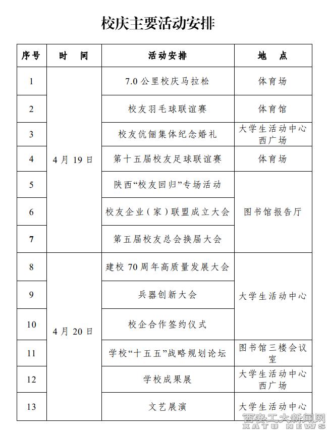 70周年校庆,是海内外全体西工人共同庆贺母校生日的一次盛会,更是ac米兰官方网站站在新的历史起点上赓续兵工精神、继往开未来,开启加快建设特色鲜明、影响广泛的国内一流高水平大学新征程的重要里程碑。校庆日前后,学校围绕兵工校庆和校友校庆两大主线,举办建校70周年高质量发展大会、兵器创新大会、校企合作签约仪式、陕西“校友回归”专场活动、学校 “十五五”战略规划论坛、学校成果展、校友伉俪集体纪念婚礼、文艺展演等校庆献礼系列活动。4月20日,学校将通过官方视频号、抖音号等平台直播建校70周年高质量发展大会盛况。