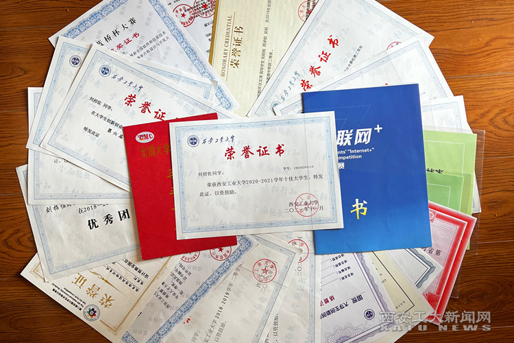 数学建模竞赛是他参加的第一个比赛,在大一什么都不会的情况下,慢慢摸索,慢慢学习。假期也选择留在学校写论文、编写代码,最后成功获得了省级一等奖。这份奖项是对他付出的肯定,也是他培养自信的开始。作为此次数学建模竞赛指导老师的伏文清,在提到刘招佐时也是赞不绝口,她说:“刘招佐对待比赛非常认真,对待学习当中的问题始终保持着一种‘倔强’的态度、钻研的精神。乐观、专注与刻苦是他身上的最大闪光点。”也正是这把打开招佐自信大门的钥匙,帮他一次又一次的完成了自己的目标。2020年至2021年共获得国家级奖项6项,国家奖学金、申请一项发明专利(第一发明人)、授权一项实用新型专利(第一发明人)、蓝桥杯软件设计大赛国家级三等奖、全国大学生光电设计竞赛三等奖、国家级大学生创新创业项目结题;2019年至2020年,获得省部级奖项8项,2019全国大学生数学建模竞赛陕西赛区一等奖、2020全国大学生数学建模竞赛陕西赛区一等奖、陕西高校第十二次大学生高等数学竞赛一等奖、第十一届中国大学生数学竞赛(非数学类)一等奖、全国大学生光电设计竞赛西北赛区一等奖、蓝桥杯软件设计大赛省部级一等奖、中国国际“互联网+”大学生创新创业大赛铜奖、全国三维数字化创新设计大赛陕西赛区三等奖;2018年至今更是获得了不少校级荣誉,一等奖学金、科技之星、三好学生、优秀团员、贾真堂奖学金、探索杯银奖、互联网+金奖和最新出炉的2021年“十佳大学生”。